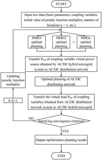 There are many methods to constrain coupling variables. Penalty function methods are mainly used today, including the quadratic penalty function form, Lagrange form [29], augmented Lagrange form [30], second-order diagonal form [31] and Lagrange dual form [32]. The augmented Lagrange penalty function has high accuracy and can achieve fast convergence. Therefore, the objective function of the AC/DC hybrid microgrid in this paper is adjusted as follows: