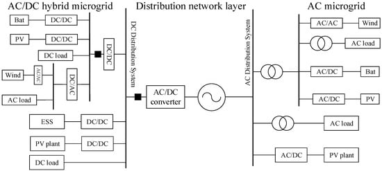 Typical structure of alternating current/direct current (AC/DC) hybrid microgrid connected to AC/DC distribution network.