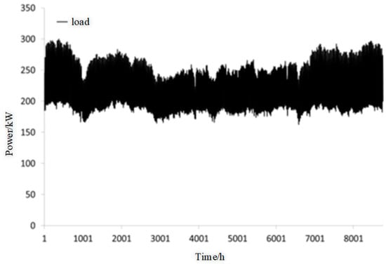 Figure 5 shows that the DC distribution network of the system is connected to a photovoltaic power station, energy storage system and AC/DC hybrid microgrid, and the AC distribution network provides power to AC loads and the AC microgrid at the same time. The new load of the system is mainly concentrated in the DC system, including a 1 MW high-voltage DC load, 400 kW low-voltage DC load and 450 kW AC load. Therefore, for the distribution network level, it is necessary to optimize the capacity optimization of PV power plants and energy storage systems, taking into account the AC load demand. For the AC/DC hybrid microgrid level, two microgrids are connected to the system, and the distributed generation in the microgrid should be optimized separately. In this paper, the upper limit of interactive power between the microgrid and distribution network is set at 500 kW. The distributed generation parameters [33], annual load curve and hourly tariff data [34] are shown in Table 1, Figure 6 and Table 2, respectively.