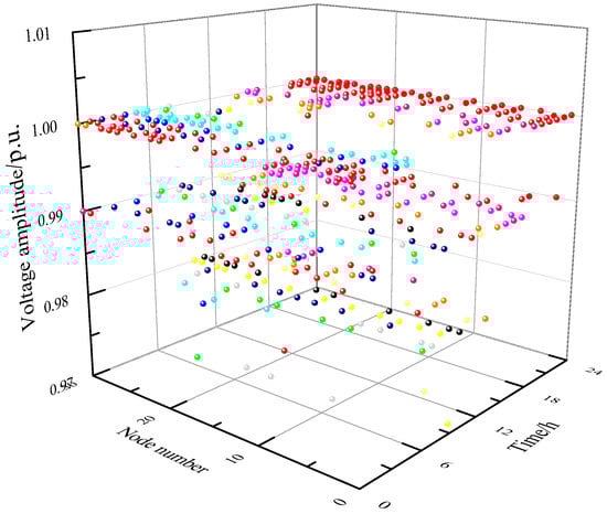 Figure 7 shows that the voltage amplitude of each node changes within the normal range, and the system remains stable. Voltage amplitude value is stable in the range of 0.98–1.0, and the voltage amplitude value of some nodes is 0.97, which is the permissible range of the system. Therefore, the stability of AC/DC distribution (micro) grid after optimization planning meets the requirements.
