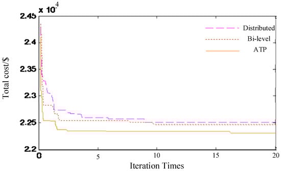 Figure 8 shows that the optimization performance of the distributed algorithm and bi-level programming algorithm is similar, and these algorithms converge prematurely after approximately 9 iterations and fall into a local optimum. Compared with the two methods mentioned above, the ATC method has strong climbing ability, and the convergence curve decreases quickly in the early stage of iteration, falls into a local optimum after approximately 2 iterations, jumps out of local optima after 5 iterations and 17 iterations, and continues to search iteratively. The final optimization result reduces the cost compared with that of the other two methods. In conclusion, the ATC method can balance the global and local search performance well and has obvious advantages in solving the co-optimization planning problem of AC/DC hybrid microgrids and AC/DC distribution networks.