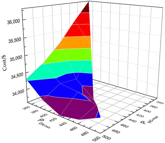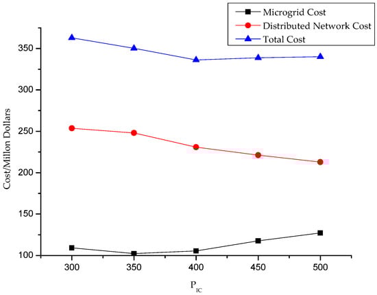 It can be seen from the figure that the system cost is higher when the upper limit value and the lower limit value of the distribution network are small, because at this time the distributed generation mainly connects to the micro-grid level, which improves the investment cost of the system. When the two thresholds are similar and float around 400 kW, the system cost changes little and the economic factors tend to be stable.