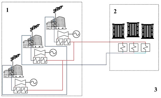 Illustration of a traditional district heating system: (1) Combined heat and power (CHP) power plants; (2) traditional heat load—district heat (DH) substations in parallel; (3) studied system with boundary connections to the fuel and electricity market.