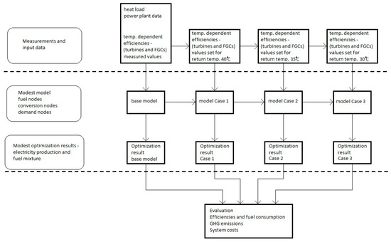 In this study, the optimization software Model for Optimization of Dynamic Energy Systems with Time-dependent components and boundary conditions (MODEST) was used. The DHS system was represented in the model by four different kinds of nodes—fuel nodes, conversion nodes (boilers, turbines, and flue gas condensers), demand nodes (traditional heat customers and low-grade heat customers), and waste nodes (electricity production and heat losses). The power plants were described in terms of the efficiencies, maximum capacity, temperature-dependent power-to-heat ratio, and temperature-dependent flue gas condenser efficiency. The heat load profile was taken from measurements from 2015. The MODEST model is described in detail by Henning [19]. In recent years, several authors have used MODEST to analyse DHS, for example Lidberg et al. [20] and Gebremedhin [21]. MODEST is a top-down tool that can be used to represent the largest flows in an energy system. Figure 4 illustrates the workflow used in this study.