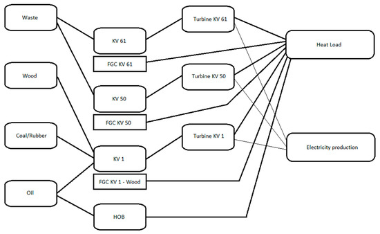 The optimization objective was to minimize the annual system cost while satisfying a given heat load demand. The fuel costs were fixed during the examined year, and were mainly set to force the model optimization algorithm to choose plants in the correct merit order. Details of the model are shown in Table 1, Table 2, Table 3 and Table 4 and Figure 5 and Figure 6.