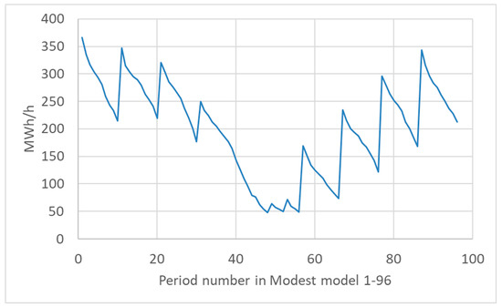 The heat load was modelled with the monthly duration diagram in Figure 6. The shortest time step used was 48 h. In total, there are 96 time steps in the model. For each of these steps the optimization algorithm chooses which plants to operate in order to satisfy the heat load (the demand node in the model). The model time division is described in Table 4. All of the fast transients (less than 48 hours) are handled with the power plant heat accumulator, so the 48 h time step is reasonable. It is also important to note that too short a time step, for example, an hour, will create false power peaks in the model that do not exist in the real CHP plant. These power peaks are handled by the accumulator.