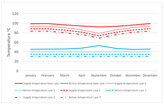 Lund et al. [6] describe the opportunities and challenges for fourth generation district heating (4GDH), and how all generations of district heating technology have been moving towards lower system temperatures, both supply and return temperatures, thereby improving efficiencies and reducing heat losses. In a survey of supply and return temperatures in Swedish DHSs, the average annual supply temperature was 86 °C and the average return temperature was 47.2 °C [11]. Roughly 20 °C lower temperatures are possible if a common indoor temperature is considered to be 22 °C and a temperature difference of 5 °C between radiator water and indoor air is added.