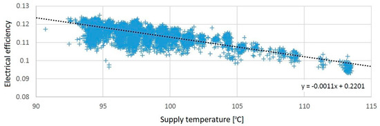 The efficiencies for backpressure turbines and flue gas condensers have been modelled with linear equations for each component. The linear equations have been calculated from plant measurements covering a period of several years. The measurements from a turbine can be seen in Figure 9, and the measurements from a flue gas condenser in Figure 10, and the equations for all of the temperature-dependent components can be seen in Table 6. Looking at these measured efficiencies, it is obvious that they are not ideally linear. However, the most important aspect for this study is the temperature-dependent trend, which is clear for both electrical efficiencies and flue gas condenser efficiencies. A flue gas condenser extracts latent heat from the flue gas to the return water. A greater difference between the flue gas temperature and the return water temperature will increase the amount of extracted heat. For the flue gas condenser (FGC) in Figure 10, it is very clear that the lower limit for the measured efficiency has a strong correlation with temperature (i.e., a low return temperature is clearly beneficial to FGC efficiency).