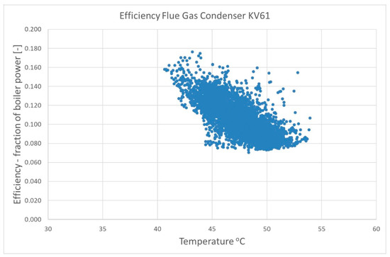 Flue gas condenser efficiency for KV 61 waste incineration unit. Samples are collected during several years and during different operation modes. There are variations in boiler power, fuel moisture, outdoor pressure, and so on. This gives a great data dispersion, but the temperature trend is clear.