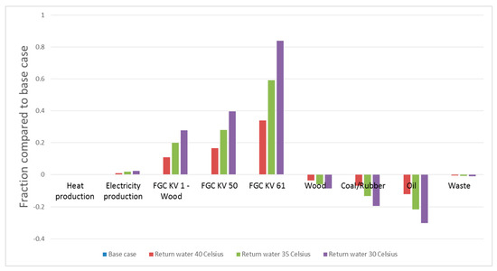 In this section, the results from the Linköping Municipality case study are presented in three different categories—efficiency, GHG emissions, and economic assessment. In Section 6.1, Section 6.2 and Section 6.3, the results are presented as relative values in comparison with the modelled base case in Figure 11 and Figure 12. Table 8 presents the absolute numbers for production and fuel use. The base case and the measured production from 2015 differ regarding the amount for each specific fuel. This is natural because the optimization model “chooses” the fuel and the power plants in a more simplistic way than the real power plant operators do. FGC KV1—Wood and FGC KV50 have not been operated at full power during 2015. However, in the modelled cases, all of the FGCs are assumed to be fully available.