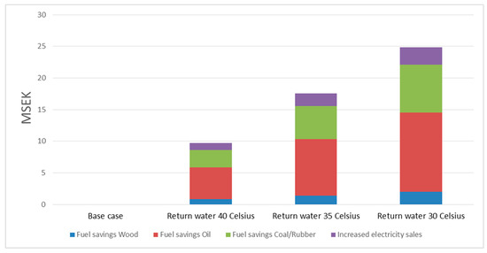 Model predictions from Section 6.3 point to a yearly value of SEK 25 million for case 3, with a 30 °C return water temperature. The associated cost for reaching that potential must be considered unknown in this study, where a concrete technical implementation is not stated.