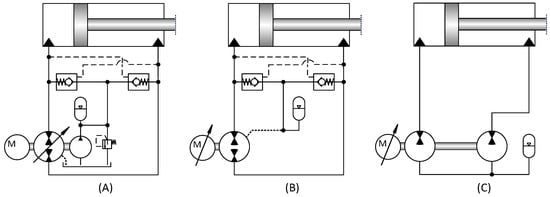 Examples on self-contained linear hydraulic drives. (A) Variable displacement, closed circuit drive. (B) Variable speed, closed circuit drive. (C) Variable speed, open circuit drive.