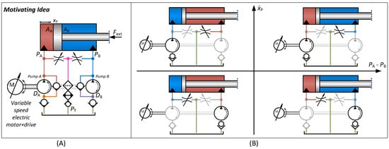 The arhitectures in Figure 1A,B are in literature considered closed circuits, i.e., the main part of the flow is passed directly back and forth between the cylinder chambers via the pump. The architecture in Figure 1C is considered an open circuit as the fluid passes between the chambers via a reservoir, and not directly between the chambers. A main advantage of using two pumps rather than a single 4-quadrant pump/motor as in Figure 1A,B is that the flow asymmetry of the differential cylinder may be directly accounted for in the event that the ratio of pump displacements is chosen equal to the cylinder piston area ratio. Such an architecture was considered in [,,], and similar architectures with a conventional reservoir [,,]. In case of a conventional reservoir, cooling and filtering of the fluid may be handled in a conventional way. Similar to the variable speed approach with a single fixed displacement pump, this approach also suffers from low pressure operation [], inducing a low drive stiffness, resulting in the same issues as discussed above. This may be improved by the inclusion of an additional pump, enabling the possibility to maintain the lower pressure at a certain level in the majority of the operating range [,,].