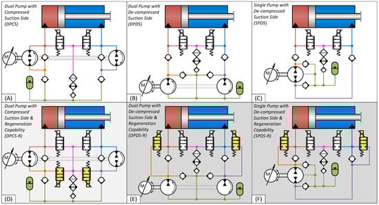 Different architectures contained in the proposed class of drives. Drives (D–F) are modifications of drives (A–C), with energy regeneration capability. The yellow valves allowing for energy regeneration are denoted auxiliary valves, whereas the white valves are denoted transmission line valves.