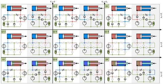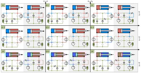 Extended four quadrant diagram(s) for drive architectures in Figure 3, when only actuating valves connecting transmission lines to the reservoir. Schematics in shaded areas are representative for architectures DPDS-R, SPDS-R, DPDS, and SPDS, whereas the schematics in non-shaded areas cover architectures DPCS-R and DPCS.