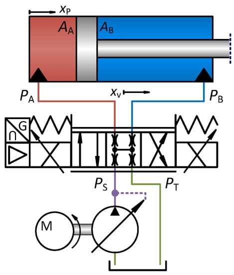 Evidently, the drive architectures share the describing equations for the cylinder motion, the check valves, the transmission line valves and volumes, the reservoir volume, and the actuator dynamics. These common describing equations are given by Equations (25)–(33), where Equations (31)–(33) describe the valve and motor/drive dynamics.