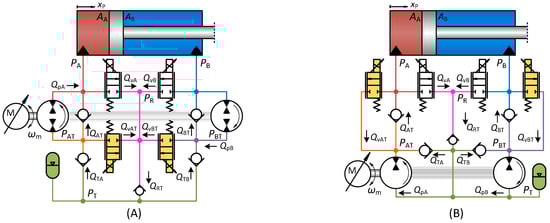 The architecture in Figure 1A rely on four quadrant transmission pumps, conventionally applied in vehicle transmissions and first proposed in []. Further on, the application of this architecture was studied in great detail in relation to the working hydraulics of mobile machines when driven by combustion engines. To mention a few of these, this architecture was considered in relation to cranes in [,], wheel loaders in [,], and excavators in [,,]. In the latter case, the power management with multiple drives was investigated [,]. This architecture maintains a proper drive stiffness as the lower chamber pressure is held at a certain level by the charge pump, which on the other hand induces certain losses as a result of its constant flow output. Another advantage with this architecture is that fluid filtering and cooling may be realized via the associated reservoir.