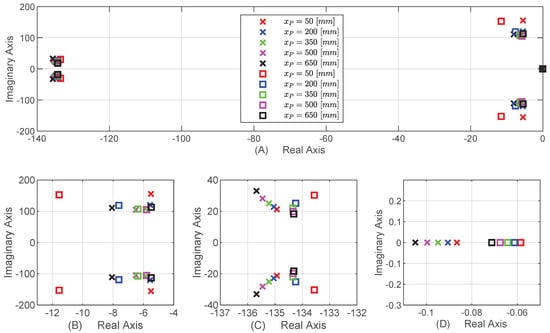 (A) Pole maps as functions of the piston position. (B,C) depict the two complex conjugate pole pairs, and figure (D) depicts the real pole. Crosses denote poles in Q1 and Q2 (and Q1-2), and squares denote poles in Q4 and Q3 (and Q3-4).