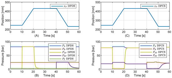 Results with velocity step sequence with [kN] and [bar]. (A) Piston position for DPDS drive. (B) Relevant pressures for DPDS drive. (C) Piston position for DPCS drive. (D) Relevant pressures for DPCS drive.