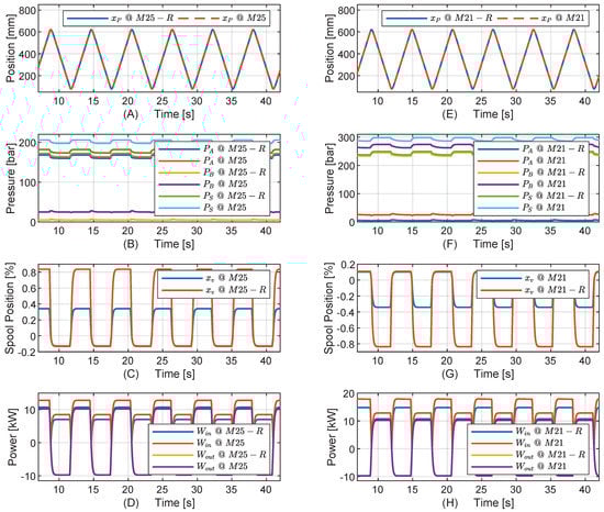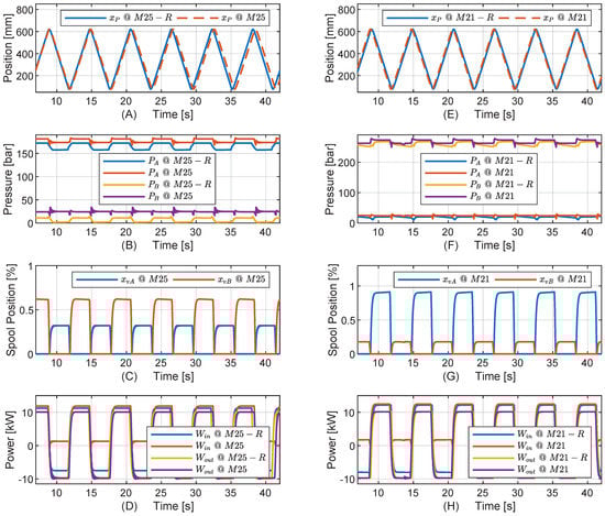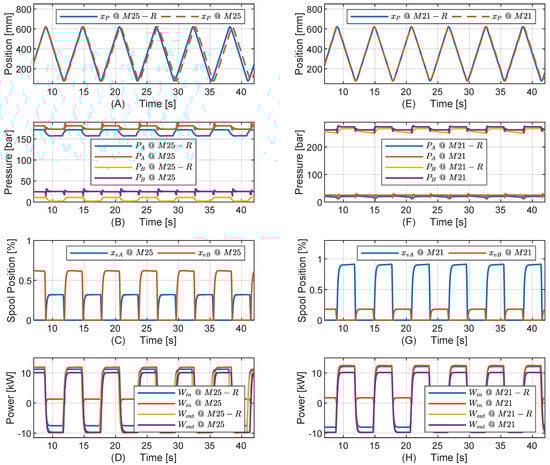 The results are depicted in Figure 9. The position variaton as a result of the step sequence is similar for both drives. Considering the DPDS, it may be observed that with stationary piston position, both pump outlet pressures , converge to the reservoir pressure , i.e., the pressure differences across the pumps converges to zero. Hence, the pump shaft torque converges to zero, and the electric motor is not carrying the load and hence no electrical losses would be present. However, the chamber pressures remain on levels dictated by the pressure setting and the external load , demonstrating the self-locking feature of the drive. The same behavior is seen for the DPCS, however here , converge to the corresponding line pressures, causing the pump pressure differences to converge to zero similar to the DPDS.