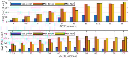 Hence, considering only these standard external gear pumps, one may realize drives with nominal (input) power up to ≈[kW], shaft torques up to ≈[Nm], and nominal flows up to ≈[L/min]. In the latter case, three of the considered valves would be required to realize the flow capacity of “one” valve as mentioned above. This may however also be realized with other valve types.