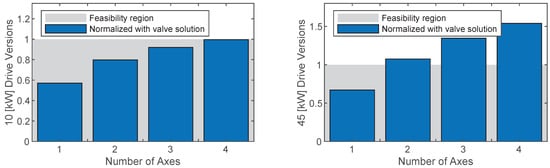 Hydraulic power units are commonly shared by several axes. Hence, for the sake of conservativeness, the comparison is made when considering 1–4 cylinder axes, all sharing the same hydraulic power unit (here designed for a single axis, i.e., it is assumed that only one axis is in motion at a time). The cost for n self-contained drives normalized with n conventional drives is evaluated from Equation (63) for .