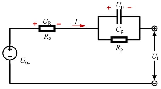 The first-order RC model is also referred to as the Thevenin model. As shown in Figure 1, the model is composed of a controllable voltage source, an ohmic resistor and a parallel RC network. The voltage source Uoc and the ohmic resistor Ro represent the OCV and the internal resistance of a battery, respectively. The RC network is used to simulate the relaxation effect of the battery [], and the elements Rp and Cp are described as equivalent polarization resistor and equivalent polarization capacitor, respectively. The IL and Ut are the load current and the terminal voltage of the battery, respectively, and are the only measurable variables in the model. Generally, IL is regarded as the input variable and Ut is regarded as the output variable. Through identifying the parameters Uoc and Ro of the model, the OCV and the internal resistance can be estimated.