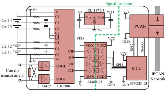 The schematic diagram of the monitor node is shown in Figure 3. With the LTC6804 chip, the voltages of four external cells were monitored. The analog input pins GPIO1 and GPIO2 of the chip were used to measure the charge and discharge currents, respectively. The network transmission of the node was established by a network interface device proposed by us in []. The network interface device is based on CAN and is named IPCAN, it can meet the transmission requirement of synchronous acquisition systems and provide synchronization signals through its SynOut pin. The LTC6804 and IPCAN are both controlled by an MCU through SPI (Serial Peripheral Interface). It is noticeable that because the LTC6804 is powered by the external cells and the MCU is powered by the IPCAN network, the signals between the LTC6804 and the MCU should be isolated. In the monitor node, a digital isolator for SPI (ADuM3151) was employed for this purpose.