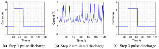 In order to verify the accuracy of the online estimation methods, a battery test method that combines pulse discharge and simulated discharge is proposed. As shown in Figure 5, the battery testing process was divided into three steps: (1) In step 1, the cell was fully rested and then a pulse discharge with current at 2.15 A (1C) was carried out. (2) In step 2, a simulated discharge with varying discharge current was implemented for 120 seconds. (3) In step 3, the cell was again rested to reach cell equilibrium and then a pulse discharge was carried out once more.