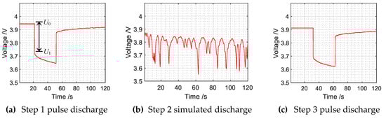 The response curve of terminal voltage for the cell in the test is shown in Figure 6. The results of pulse discharges can be used for estimating battery parameters offline. As shown in Figure 6a, because the battery was fully rested, the measured terminal voltage U0 before the pulse discharge was equal to its OCV. When the discharge pulse was applied, the terminal voltage dropped from U0 to U1 suddenly. This phenomenon is mainly caused by the internal resistance of the cell, and the internal resistance can be estimated as follows []: