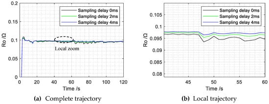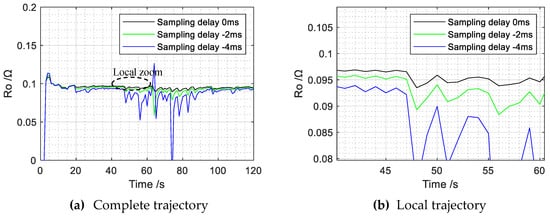 In order to analyze the influence of sampling delay on the traditional online estimation method, the sampling delay of measured current and voltage in the step 2 discharge wa manually changed from −4 ms to 4 ms, and the above online estimation process was repeated. As analyzed in Section 2.2, the sampling delay will cause the estimation results to fluctuate. Besides, the offline estimation results indicate that the internal resistance is basically unchanged in the step 2 discharge. Hence, the estimation accuracy of internal resistance can be used for showing the influence of sampling delay.