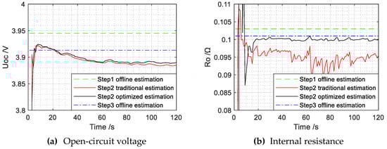 The trajectories of estimated battery parameters in the estimation process are shown in Figure 7. The green dashed line and blue dot-dashed line denote the offline estimation results of step 1 and step 3, respectively. The red line refers to the online estimation result in step 2, showing that the estimated parameters begin to converge after eight seconds. For the OCV shown in Figure 7a, the initial estimated result is 3.922 V, which is 23 mV less than the offline result of step 1. The final estimated result is 3.884 V, which is 29 mV less than the offline result of step 3. For the internal resistance, the mean value and standard deviation of online estimated results is 0.0949 Ω and 1.7 mΩ, which is close to the offline estimation results. In summary, with the traditional estimation method, the estimated OCV is about 29 mV less than its actual value, and the estimated internal resistance is close to its actual value but is fluctuant.