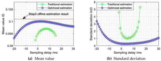 Finally, we changed the sampling delay from −20 ms to 30 ms, repeated the optimized estimation process again and then calculated the mean and standard deviation of estimated internal resistances between 20 s and 120 s. The mean value and standard deviation are shown in Figure 14a,b, respectively, in which the results of traditional estimation method are also present. Three conclusions can be drawn: (1) For optimized estimation method, when the sampling delay is 3 ms, the estimation accuracy is the highest. The mean value and standard derivation of estimated internal resistances are 0.1001 Ω and 0.26 mΩ, which is much closer to the offline result in step 3. (2) Under the same sampling delay condition, the estimation accuracy of the optimized method is higher than that of the traditional method. The mean value of the estimated internal resistances is closer to offline results and the fluctuation range is smaller. (3) The tolerance range of sampling delay of the optimized method is much larger than that of the traditional method. While the sampling delay reaches −10 ms or 30 ms, the estimation accuracy is still higher than what can be achieved by the traditional method. In summary, the optimized method for online estimating battery parameters has higher estimation accuracy and effectively improves the tolerance range of sampling delay.