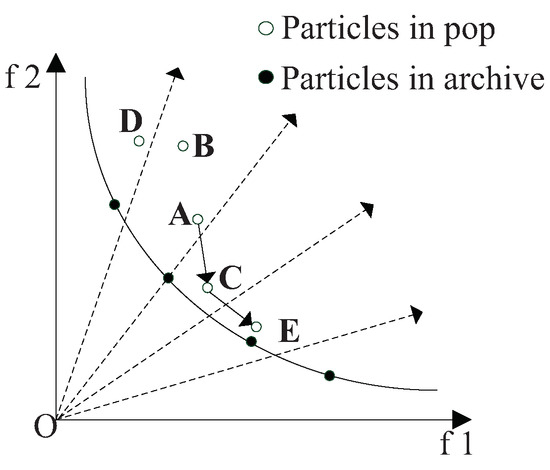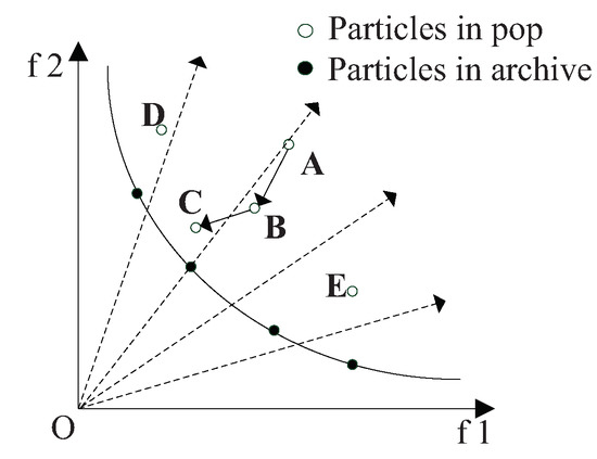 where is the template chosen from the population, which has been sorted by the aggregate function based on Tchebycheff decompose; is the best value of the chosen particle; in the ideal state, by using the decomposition method, N direction vectors will be generated uniformly in the multi-objective solution space, so as to divide the population into N subproblems, and each particle is upadated based on the direction vectors. As shown in the Figure 5 and Figure 6, the dotted lines represent the direction vectors that partition the objective space. The solid lines represent the true frontier of the function. The solid dots represent the particles of elite archive. The hollow dots represent the particles of the population. In the update process, A is the position at the previous moment, B is the position at the current moment, and C is the position at the next moment. The individual optimal value update mode of CLPSO is shown in Figure 5, and the optimal particle individual plays a guiding role in the search of the whole population. In order to update , the decomposition method should be adopted to scale the multi-objective problem. Tchebycheff method is used to construct the aggregation function in this paper. By calculating the aggregate value of each particle, the binary tournament will remain throughout the binary tournament. The global optimal value update method for traditional PSO is shown in Figure 6. In Figure 6, the global optimal value of particle swarm is used to guide the development of particles, and the global optimal value of the particles is updated by using the information of the neighborhood particles.