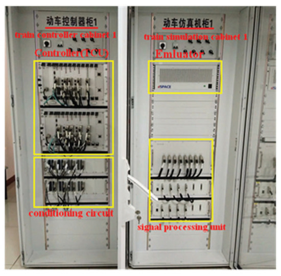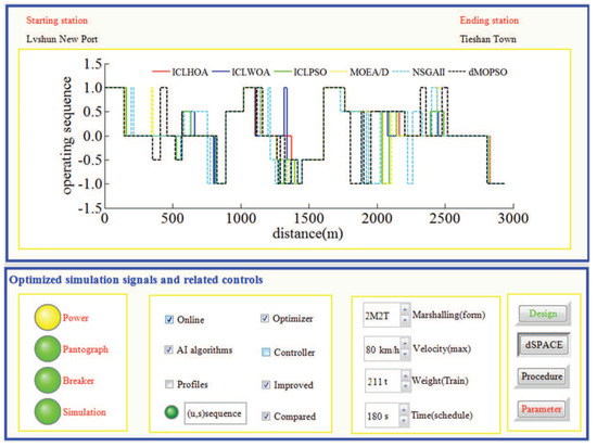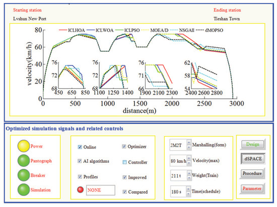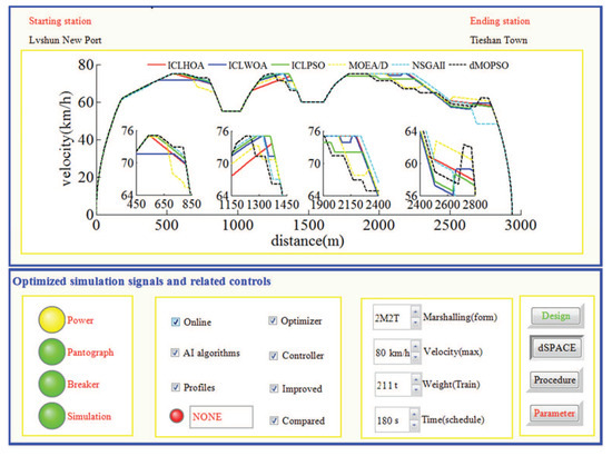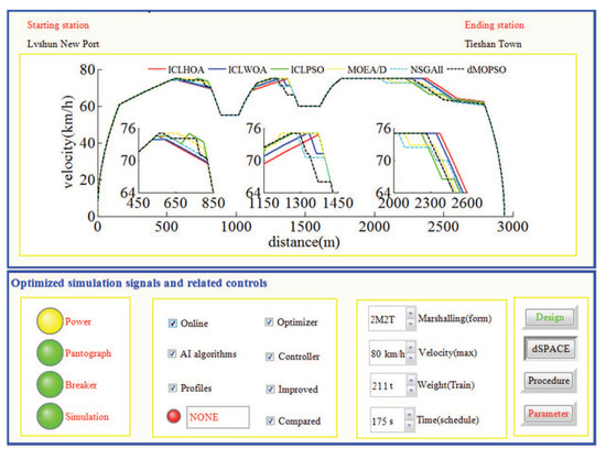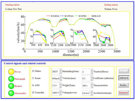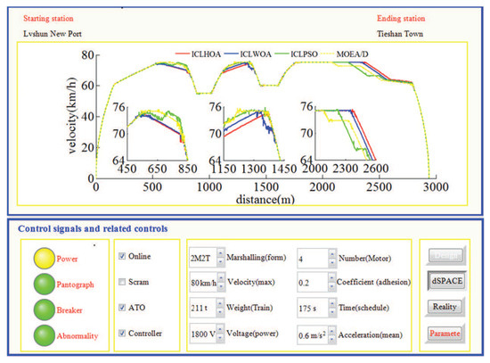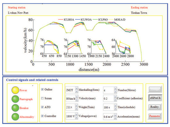 As can be seen from Figure 26 and Figure 27, whichever control algorithm is adopted (MPC or fuzzy PID), when RCL-HILS real-time tracking control is applied, the power supply was switched on, the pantograph was raised, and the circuit breaker is normally closed. At the same time, the dSPACE simulator was in the simulation state (the ‘dSPACE’ button is pressed and the ‘reality’ button was waiting to be pressed), the design parameters cannot be changed in the tracking control state (the ‘design’ button was white) and the given parameters cannot be changed (the ‘parameters’ button was red). As can be seen from the four enlarged areas in Figure 26 and Figure 27, whichever control algorithm was adopted (MPC or fuzzy PID), the tracking control speed curve corresponding to ICLHOA was optimal compared with other algorithms. Because the ideal curve obtained by ICLHOA was relatively smooth, it was easier to avoid the phenomenon of unstable speed control caused by signal transmission delay, limited control performance and uncertain disturbance in the simulation process. The reason is that the ICLHOA optimizer (MPU) kernel chip has more powerful optimization ability to find a more optimized target speed distance curve, and the target speed distance curve is smoother, which is easy to be tracked by a tracking control algorithm. It can be seen from Table 6 that, in terms of the actual running time, ICLWOA and ICLPSO algorithms barely reached the standard under RCL-HILS, and the running time error was about 0.2 s; NSGAII and dMOPSO algorithms can reach the standard under ICL-HILS, but they cannot be tracked and controlled under RCL-HILS due to insufficient margin, and the running time errors were 0.1912 s and 0.1797 s, respectively. If the comfort level was limited below 175 (m/s, the target velocity trajectory obtained by MOEA/D algorithm cannot be tracked and controlled under the current conditions. To sum up, ICLHOA was more suitable for solving ATO multi-objective train operation process optimization problem, and the actual train operation process results can meet the expected assumptions even under RCL-HILS. Furthermore, a large number of control algorithms (such as MPC and fuzzy PID) are suitable to being used as tracking control algorithms for ATO. However, some control algorithms (such as MPC) with good tracking performance are more recommended. Compared with fuzzy PID, more ideal tracking results is obtained by adopted MPC (as shown in Figure 26 and Figure 27 and Table 7 and Table 8), the fluctuation of velocity was more restrained (as shown in the four enlarged areas in Figure 26 and Figure 27, especially the enlarged area which distance interval was [2400,2800]).
