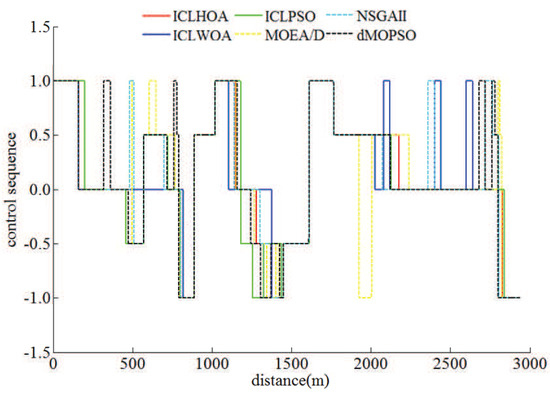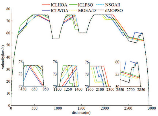 At running time arrangement plan, the planned running time of the simulation line was 180 s in the flat time period (the traffic is relatively ideal, such as weekday morning 9:00–11:00 h), the planned running time is 175 s during peak time period (the traffic is relatively nervous, such as weekday morning 6:00–8:00 h). If the planned running time was 175 s, there were still similar simulation conclusions under the same calculation conditions, which further indicates that ICLHOA is more suitable for solving ATO multi-objective train running process optimization problem. Under RCL-HILS, the optimal target velocity distance curves and their corresponding optimization results obtained by different algorithms and the actual velocity distance curves and their corresponding control results obtained by some algorithms through tracking MPC are shown in Figure 28 and Figure 29 and Table 9 and Table 10.