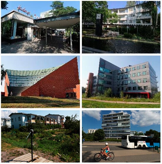 Eco-Viikki has attracted a lot of attention both nationally and internationally since it was built in the 1990s, following an architectural competition that specified that proposals had to be ecologically sustainable through the minimization of the use of non-renewable energy sources and rapidly diminishing raw materials, reduction of pollution levels, noise and waste; minimization of the stress on natural resources and local ecosystems; residents empowerment and awareness raising on ecological sustainability []. Research programmes for Sustainable Development and Ecological Buildings were initiated to establish what sustainable development in urban planning and building entails. The need to test ecological principles in practice resulted in an invitation to local authorities around the country to work on experimental ecological construction in January 1994 []. Figure 1 shows a few images of the main references discussed.