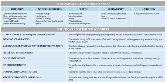 Ecological building criteria for Eco-Viikki and main solutions adopted. Own elaboration based on content in [].