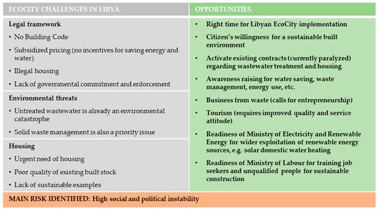 Table 1 summarizes the activities arranged during the Mission and the priority topics discussed, whereas Figure 4 shows the challenges, opportunities and risks identified during those discussions for EcoCity development in Libya. However, even though Libyan stakeholders were quite well represented and the agenda was very efficiently organized considering the relatively short time available, unfortunately civil society organizations (CSOs) and citizens associations were not engaged in those activities. This could have been solved in the subsequent phases, but as abovementioned, Phases II and III were never undertaken.