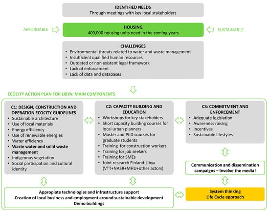 Based on the understanding of the Libyan context and needs obtained from the abovementioned discussions and targeted visits, an EcoCity Action Plan was proposed to be discussed with and validated by MHU (see Figure 5) including three main components: