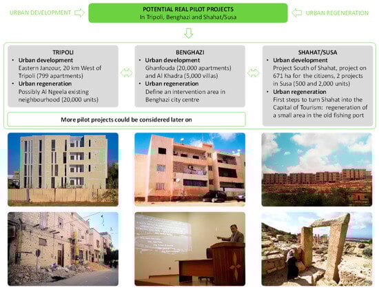 The main components included in the Action Plan would be developed through real pilot projects in Tripoli, Benghazi and Shahat/Susa (Figure 6). The proposed projects dealt both with urban development (new housing) and with urban regeneration (refurbishment of existing neighbourhoods), and included different building typologies.