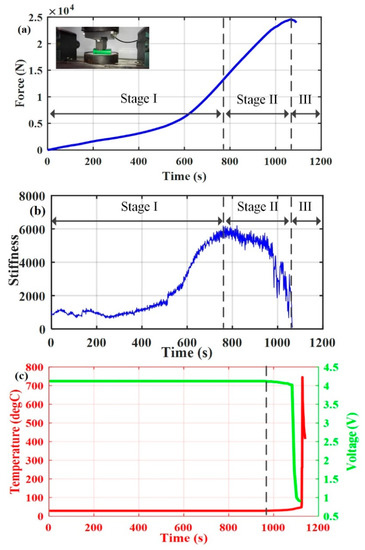 A WDW-100 10 T Universal Test Machine was used to perform indentation tests on the fully charged Li-ion batteries at a quasi-static rate of . The specifications of 18650 Li-ion batteries used in the tests are listed in Table 1. Battery voltages and temperatures were monitored and sampled in situ by HIOKI MR8880 and FLUKE TI 400. FLUKE TI 400 is an infrared camera with accuracy of ±2 °C, which was located in front of the mechanical test platform to take thermal images. It should be noted that some necessary measures were carried out to ensure the safety of the tests. Figure 1 shows the testing results of mechanical, electrical, and thermal responses for the fully charged Li-ion battery during indentation tests. The derivative of the force in Figure 1a with respect to displacement is defined as the stiffness of Li-ion batteries, as shown in Figure 1b. It can be seen from Figure 1a,b that three distinct stages were identified. In stage I, the stiffness of the battery structure kept increasing as the intrusion continued until it reached the maximum value, and this stage was regarded as a densification process (see Figure 1b). In stage II, as the deformation continued, microscopic damage appeared inside the battery after the maximum stiffness was reached, such as microscopic cracks or microscopic holes visible in the scanning electron microscope (SEM) images of the micro-structure of the electrodes during deformation [34]. In stage III, as the deformation continued further, macroscopic fracture appeared inside the battery after the peak force was reached (see Figure 1a), such as macroscopic cracks or macroscopic holes, which finally initiated the macroscopic failure process. As depicted in Figure 1a, the peak force took place at 1068 s, which represented the end of Stage II and the initiation of Stage III.
