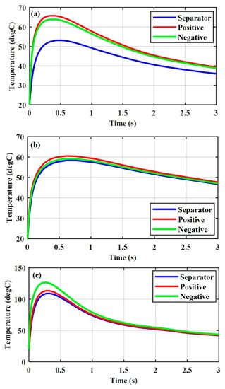 Figure 2 shows the thermal responses under different ISC types for the Li-ion battery at SOC = 0.2 and . Figure 2a shows the thermal response under the positive–negative ISC. The temperature rise in the positive and negative electrodes was almost the same, while that in the separator was much lower. For the case of the copper-positive ISC, the temperature rise in all three components was almost the same as depicted in Figure 2b. Although the ISC resistance of the copper-positive ISC was slightly lower than that of the positive–negative ISC (see Table 4), the temperature rise in the positive and negative electrodes under the copper–positive ISC was slightly lower than that under the positive–negative ISC because of the higher thermal conductivity of copper, as shown in Figure 2a,b, respectively. Therefore, the effect of the material properties of the ISC object on the thermal response could not be ignored. Figure 2c shows the thermal response under the aluminum-negative ISC. The temperature rise in the positive electrode and separator was almost the same, while that in the negative electrode was higher than that in the positive electrode and separator.