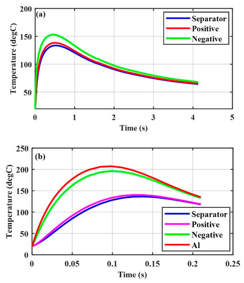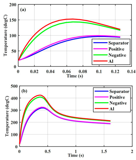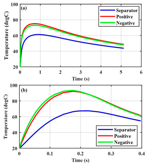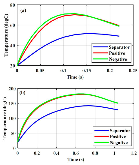 Figure 5a shows the thermal response under positive–negative ISC at SOC = 0.2. The temperature in the negative and positive electrodes increased from the initial value of to almost in 0.12 s. Figure 5b shows the thermal response under the positive–negative ISC at SOC = 0.6. The temperature in the negative and positive electrodes increases from the initial value of to almost in 0.63 s.