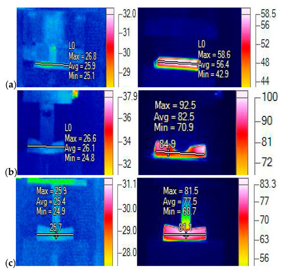 For the experiments of Li-ion batteries at the low SOC, the tests with three different loadings were performed, which corresponded to the compression test between two rigid plates, the indentation test with a rigid rod of 12 mm in radius, and the compression test with a hemispherical punch of 7 mm in radius. Their thermal responses were recorded as shown in Figure 7, where the images on the left side provides the maximum, minimum, and average battery temperatures at the onset of a macroscopic failure corresponding to the start, and the images on the right side provide the maximum, minimum, and average battery temperatures at the moment of its maximum value. For the case of a Li-ion battery compressed by two rigid plates, its temperature increased to (maximum temperature) after 300 s, as shown in Figure 7a on the right side. For the case of a Li-ion battery compressed by a rigid rod, its temperature increased to the maximum value after 100 s, as shown in Figure 7b on the right side. For the case of a Li-ion battery compressed by a hemispherical punch, it took about 200 s to reach the maximum temperature of , as shown in Figure 7c on the right side. These results indicate that the Li-ion batteries at low SOCs did not go into thermal runaway under the three loadings, which agrees with the simulation results of the Li-ion batteries at low SOCs under various ISC conditions, even with a large damaged area under the most dangerous case of the aluminum-negative ISC, as shown in Figure 2, Figure 5a and Figure 6a, respectively.