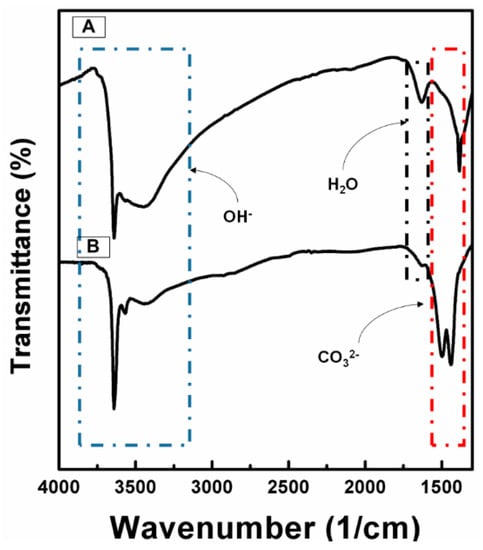 Figure 1 shows the FTIR spectra of precursors from each process, namely NCA-PCP and NCA-PSS. The absorbance spectra of NCA-PCP and NCA-PSS samples show similar results to those of studies by Agarwal et al. on Ni nanoplates [26], Motlagh et al. on Ni(OH)/NiO nanoparticles [27], and Seo et al. on Li(Ni0.8Co0.16Al0.04)O2 materials [15]. The sharp peak around the value of 3600/cm and the broad peak around the value 3400/cm indicate a stretching mode of the disturbed hydroxide group and stretching vibration of the free hydroxide group, which correspond strongly to the presence of metal hydroxide species (Ni(OH)2). The peak around 1600/cm indicates the bending mode of water molecule vibration, while the peak around 1400/cm indicates a CO32− stretching band, so it could be concluded that the sample contained carbonate and water species due to the direct contact of sample powders with air during the preparation. Double peaks which occurred in NCA-PSS were caused by the presence of LiOH in the composite, which is easily converted to Li2CO3 under an atmospheric condition. As a result, sample NCA-PSS has a stronger carbonate peak compared to NCA-PCP. Based on Figure 1, the co-precipitation of the hydroxide precursor using technical grade starting materials shows no observable oxide impurities, which often occurs during atmospheric co-precipitation of Co in a highly alkaline solution [28]. The oxidation of Co is prevented due to the de-aeration process before the co-precipitation process occurs.