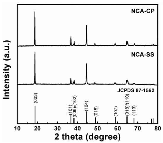 XRD patterns of NCA samples prepared by batch co-precipitation (NCA-CP) and the solid state reaction method (NCA-SS).