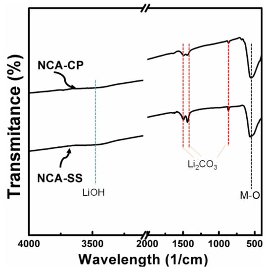 The surface composition of the NCA samples is conducted by analyzing the FTIR spectrum measurement, as shown in Figure 3. It can be clearly seen that the carbonate compound is found on the surface of the sample (860/cm, 1492/cm, and 1499/cm), which could be attributed to Li2CO3 as a result of excess Li source [35,36]. During the heating process, hydroxide and carbonate species, as confirmed in Figure 1, are decomposed into H2O and CO2, while residual LiOH is converted into Li2CO3, so the former peaks are observable, while the LiOH peak is hardly noticeable. Previous studies have suggested performing washing of the obtained NCA powders; however, washing such material using demineralized water may cause structural change, e.g., an inactive rock-salt structure, and to overcome such phenomena requires a reheating process at a high temperature that is considered uneconomical [36]. Therefore, we decided not to perform any further treatments of the samples.