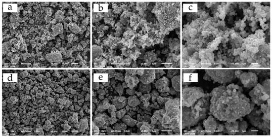SEM images of (a) NCA-CP at 1000× magnification, (b) NCA-CP at 3000× magnification, (c) NCA-CP at 10,000× magnification, (d) NCA-SS at 1000× magnification, (e) NCA-SS at 3000× magnification, (f) NCA-CP at 10,000× magnification.