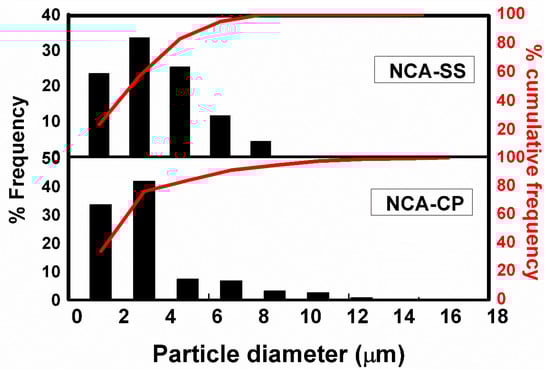 Further particle analysis was conducted using a statistical method and the results are presented in Figure 5. Based on Figure 4a,d, the size of the secondary particles is collected and classified into grouped data. NCA-CP and NCA-SS have a similar narrow particle size distribution. The average sizes of the particles, D10, D50, and D90, are shown in Table 3. The D50, or the median, has been defined as the diameter where half of the population lies below this value. Accordingly, 90% of the distribution lies below the D90, and 10% of the population lies below the D10. NCA-CP samples have a relatively smaller average diameter compared to previous studies that used the continuous co-precipitation method [22,23,24,25], which, as predicted before, could be caused by aluminum ion dissolution at a high pH, which hinders particle growth [17,37]. However, smaller-sized particle have advantages such as a larger surface area and faster Li-ion diffusion compared to particles with a larger size.